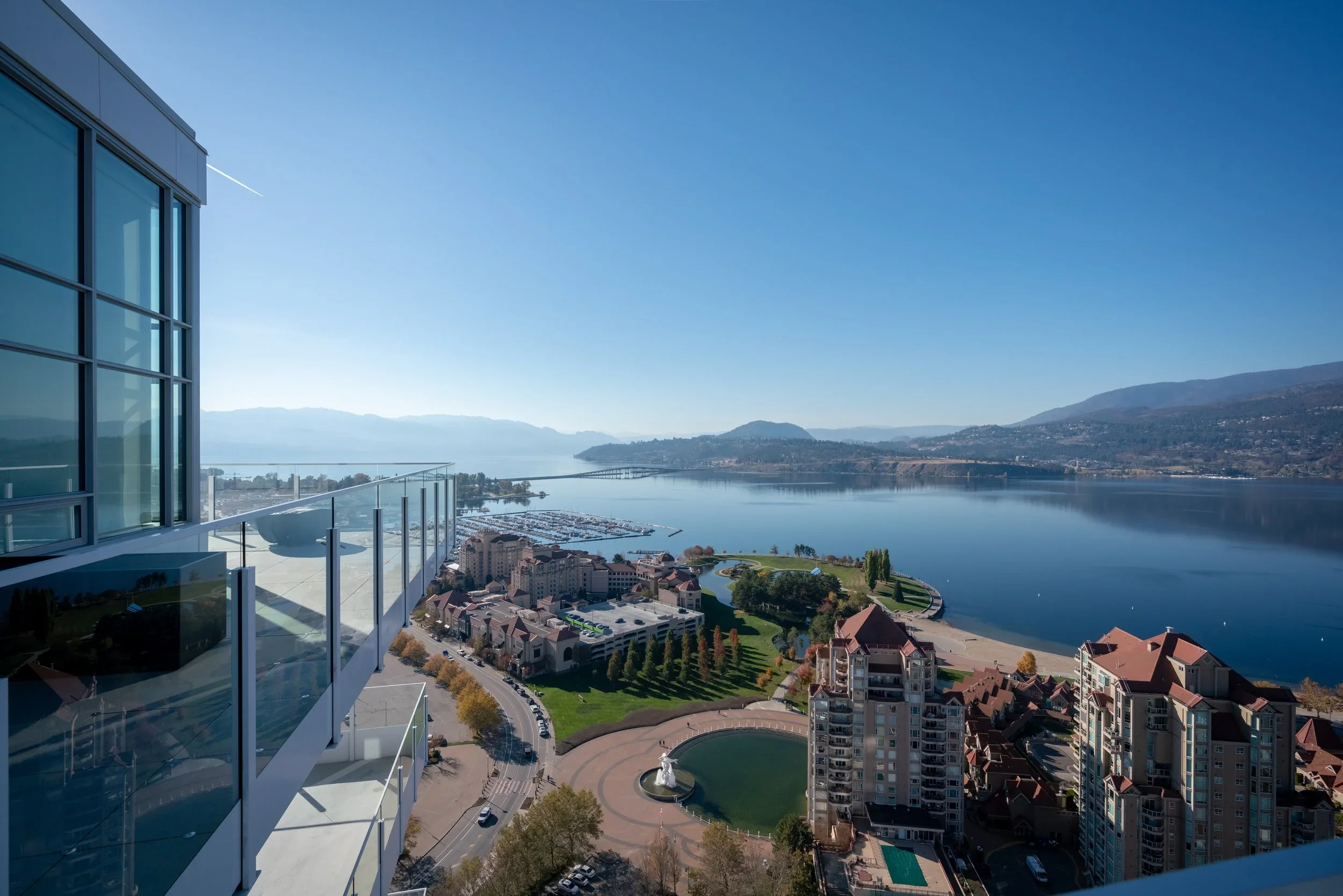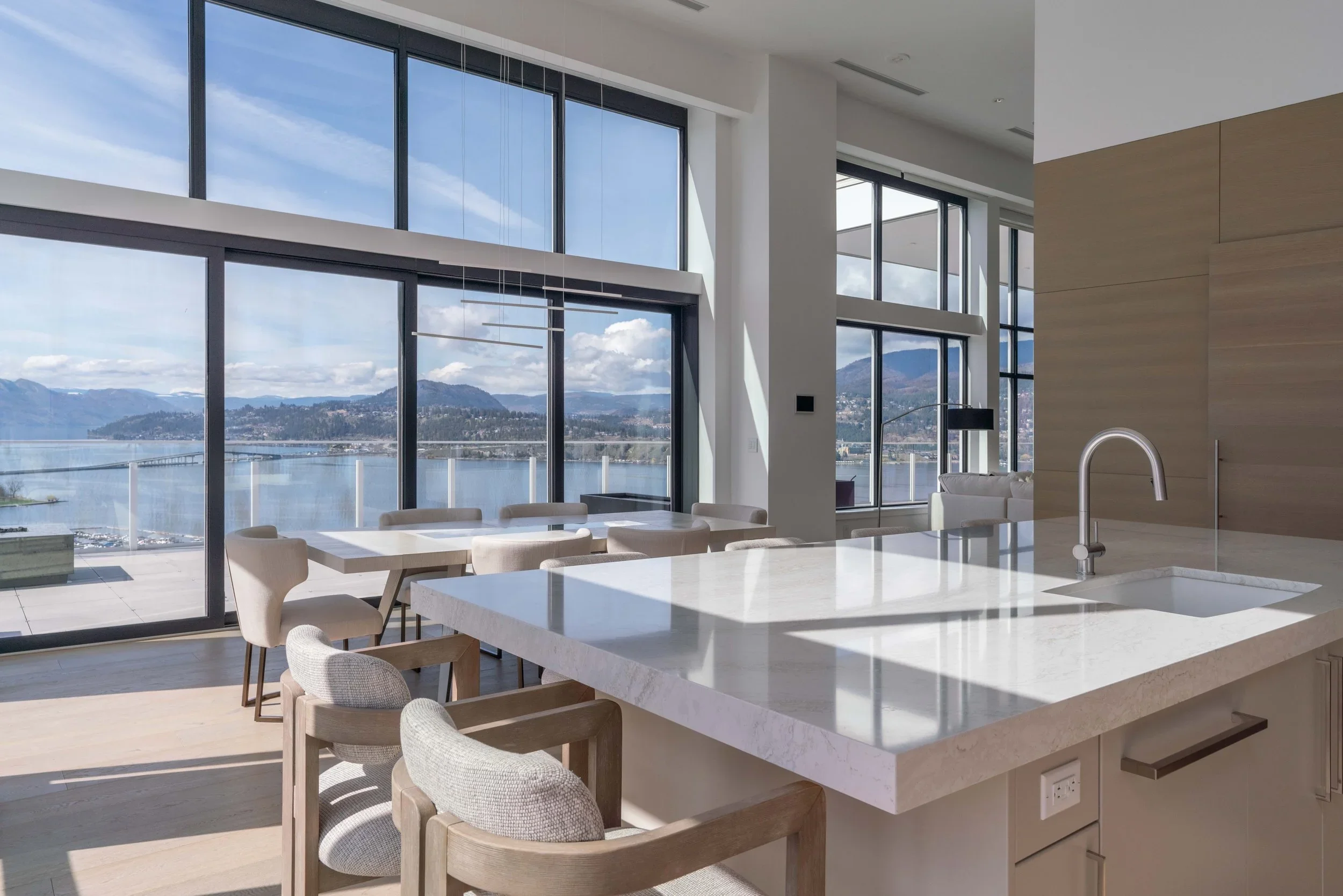The East Tower penthouse occupies the full 36th floor and offers sweeping 360-degree views of Okanagan Lake and the surrounding valley. The interior design embraces a minimalist yet warm aesthetic, balancing clean lines with rich materiality.